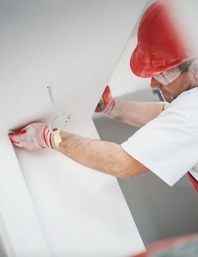 Expert measurement, cutting, and fastening of drywall sheets to ceilings and walls.